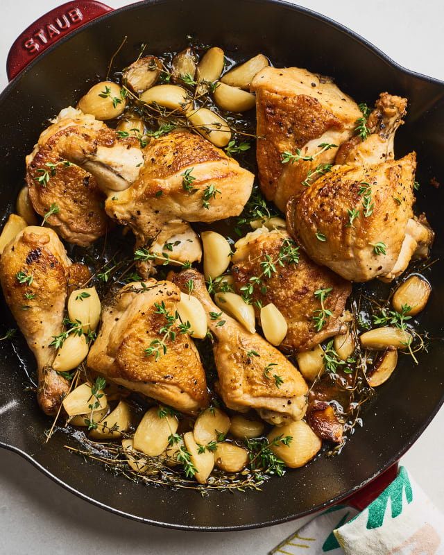 As written, the recipe only has four main ingredients: a whole chicken (cut into eight pieces), lots of olive oil, fresh thyme, and a ton of garlic cloves. It promises to give off "an aroma that wraps the kitchen like a hug," and while that part lived up to its promise, I found other aspects of the recipe to be seriously lacking. Here's what I thought of it all.