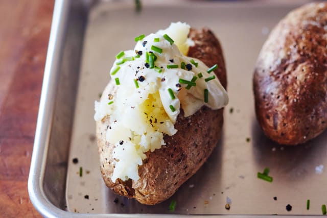 No matter which method you choose to use, be sure to wash the potato and prick it all over with a fork. Forgetting that crucial pricking step will result in a spud grenade in your oven — pricking the skin lets the steam inside the cooking potato escape without this risk of bursting.